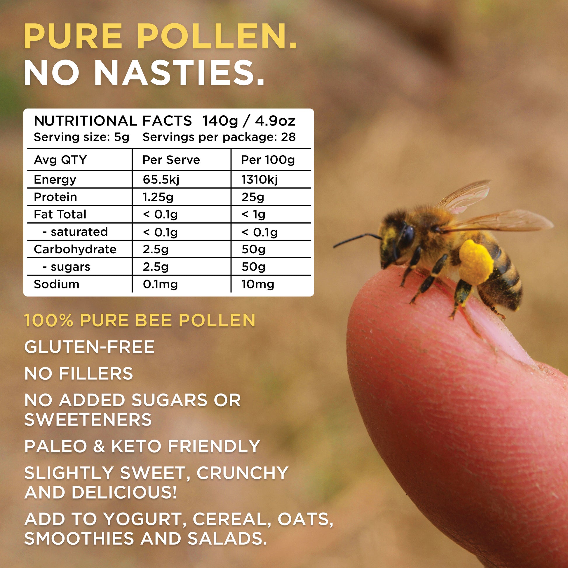 Bee pollen is slightly sweet, crunchy and delicious! Add to foods like yogurt, cereal, smoothies and salads. Bee pollen is an excellent addition to a healthy, balanced lifestyle. Take up to 1 tablespoon per day.