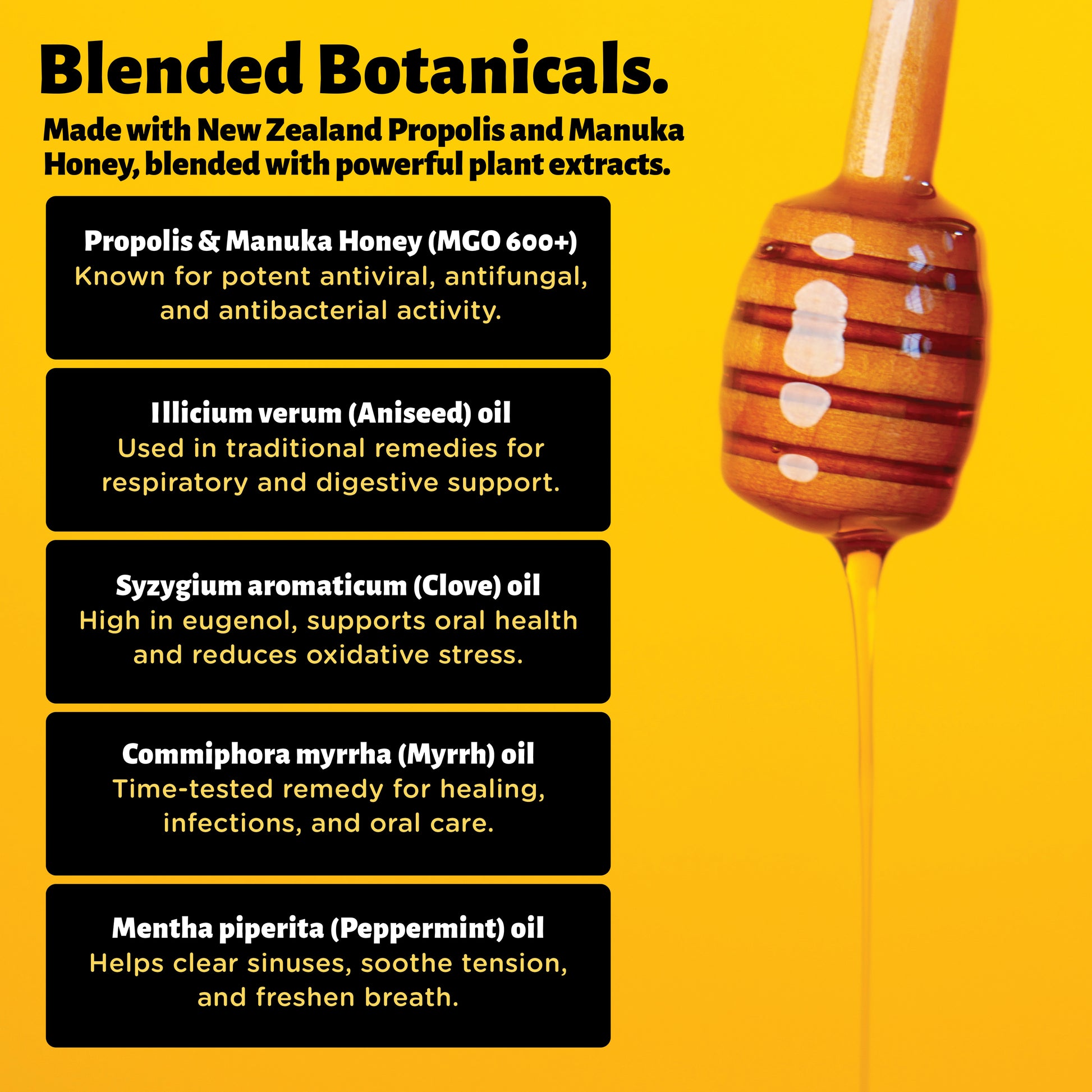 Propolis & Manuka Honey (MGO 600+): Known for potent antiviral, antifungal, and antibacterial activity