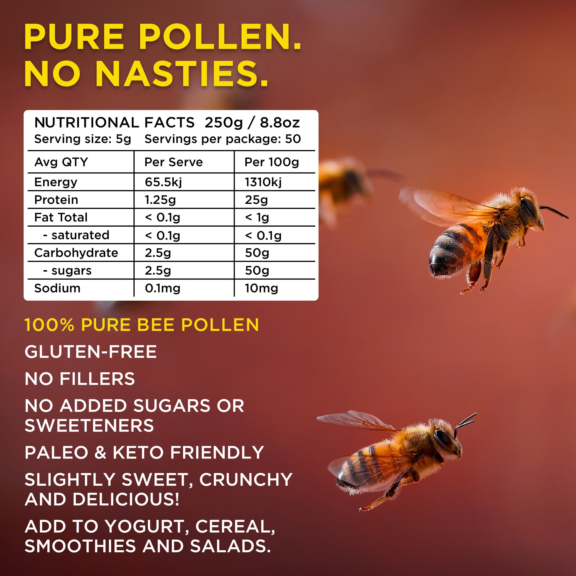Bee pollen is slightly sweet, crunchy and delicious! Add to foods like yogurt, cereal, smoothies and salads. Bee pollen is an excellent addition to a healthy, balanced lifestyle. Take up to 1 tablespoon per day. Gluten-free, paleo and keto-friendly.
